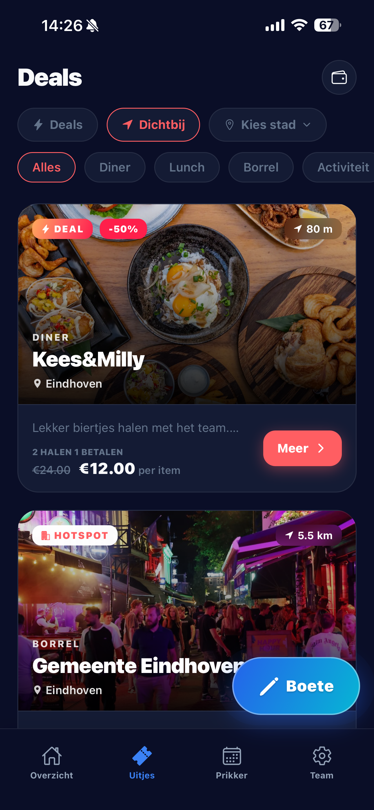 Jouw deal staat voor alle TeamPot-gebruikers in de app. Ze kunnen hem opslaan als favoriet en een datum prikken voor het uitje.